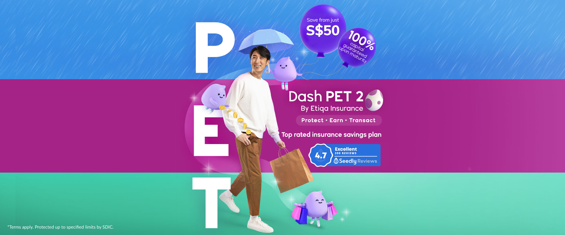 Dash PET is not a bank account or a fixed deposit. It is an insurance savings plan that earns a crediting interest rate. This product’s availability is based on a first-come, first-served basis and Etiqa Insurance reserves the right to close the tranche at any time without prior notice.