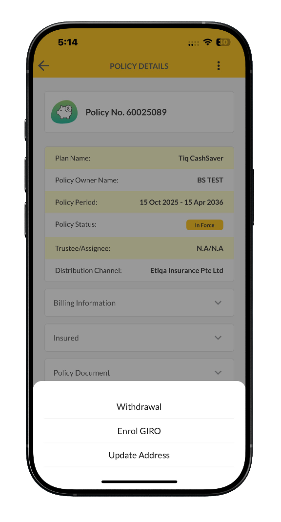Skip lengthy phone calls or emails and manage your Tiq CashSaver policy with the Tiq by Etiqa app.