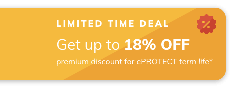 Limited Time Deal! Get the assurance of term life insurance with greater savings today! With ePROTECT term life, you can enjoy up to 18% premium discount* throughout your policy term. Terms apply. Find out more